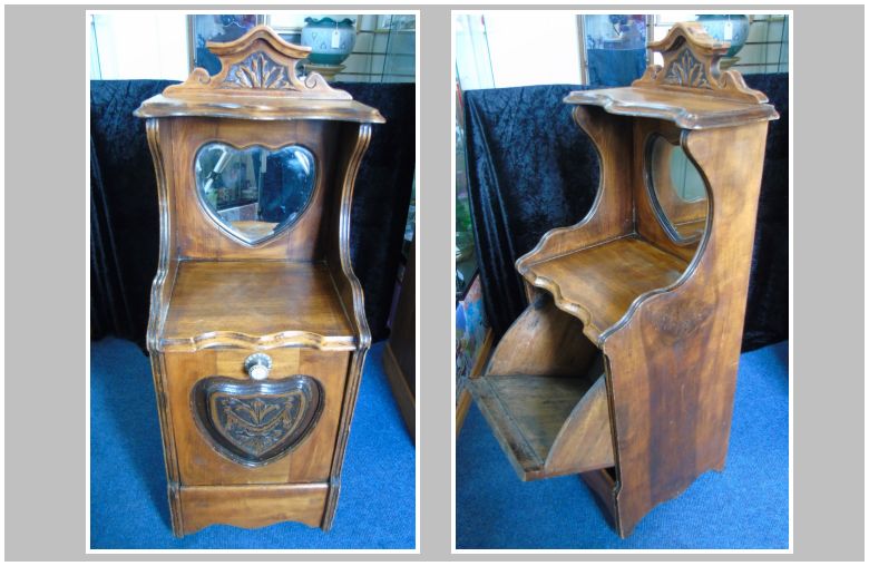 Made over 100 years ago, in 1901 to be exact, this Purdonium has a certain rustic charm about it and is presented in used but good condition, which is reflected in its price. It boasts its’ original castors and ceramic handle and has a pretty heart shaped carving and a heart shaped mirror to the front.