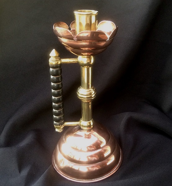 Crafted between 1880 - 1890, it is constructed from Copper and Brass and is wonderfully artistic in its design. The copper base resembles half of a beehive, whilst the upper candle holder section is presented in flower form with a mirrored beehive design. A simple brass column lovingly joining the two parts. And if that isn’t interesting and eye-catching enough, we are then treated to a superbly turned ebonised fruit wood handle, adjoined to the column, thus making it extremely easy to lift or move around. This is anything but your average candlestick.