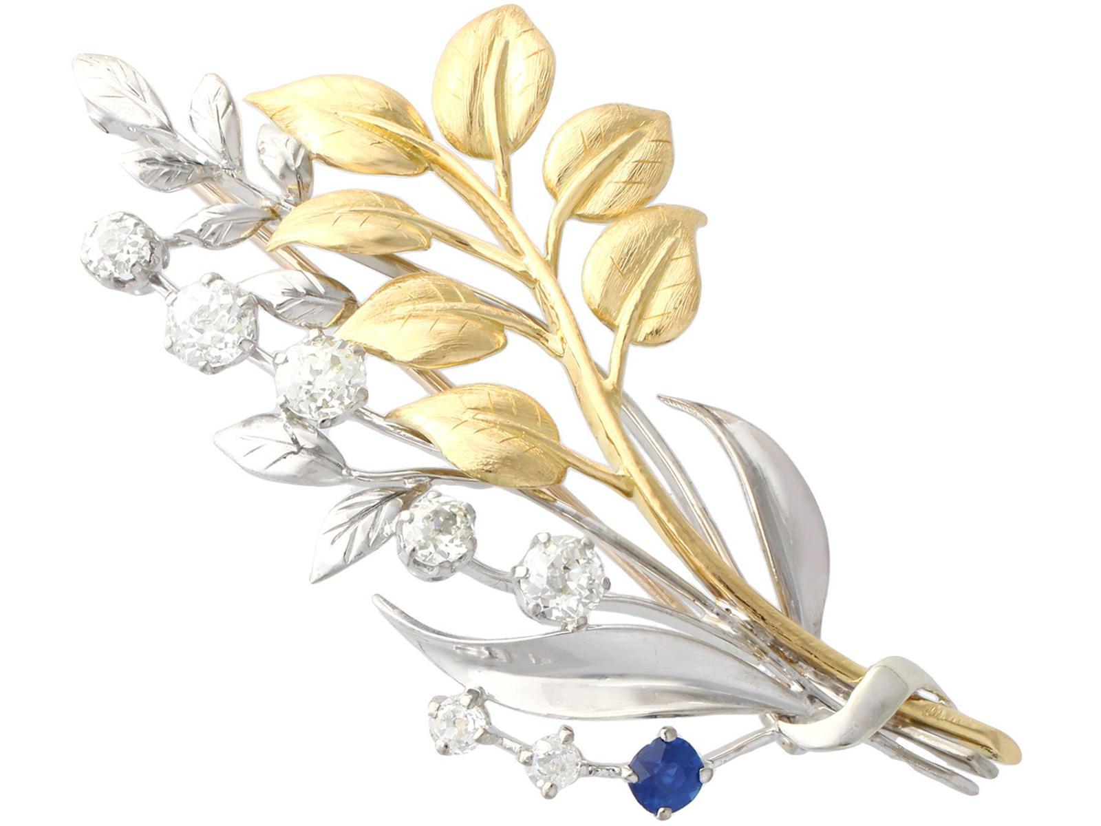 0.22ct Sapphire & 1.82ct Diamond, 18ct Yellow & White Gold Spray Brooch c.1930 (1 of 9)