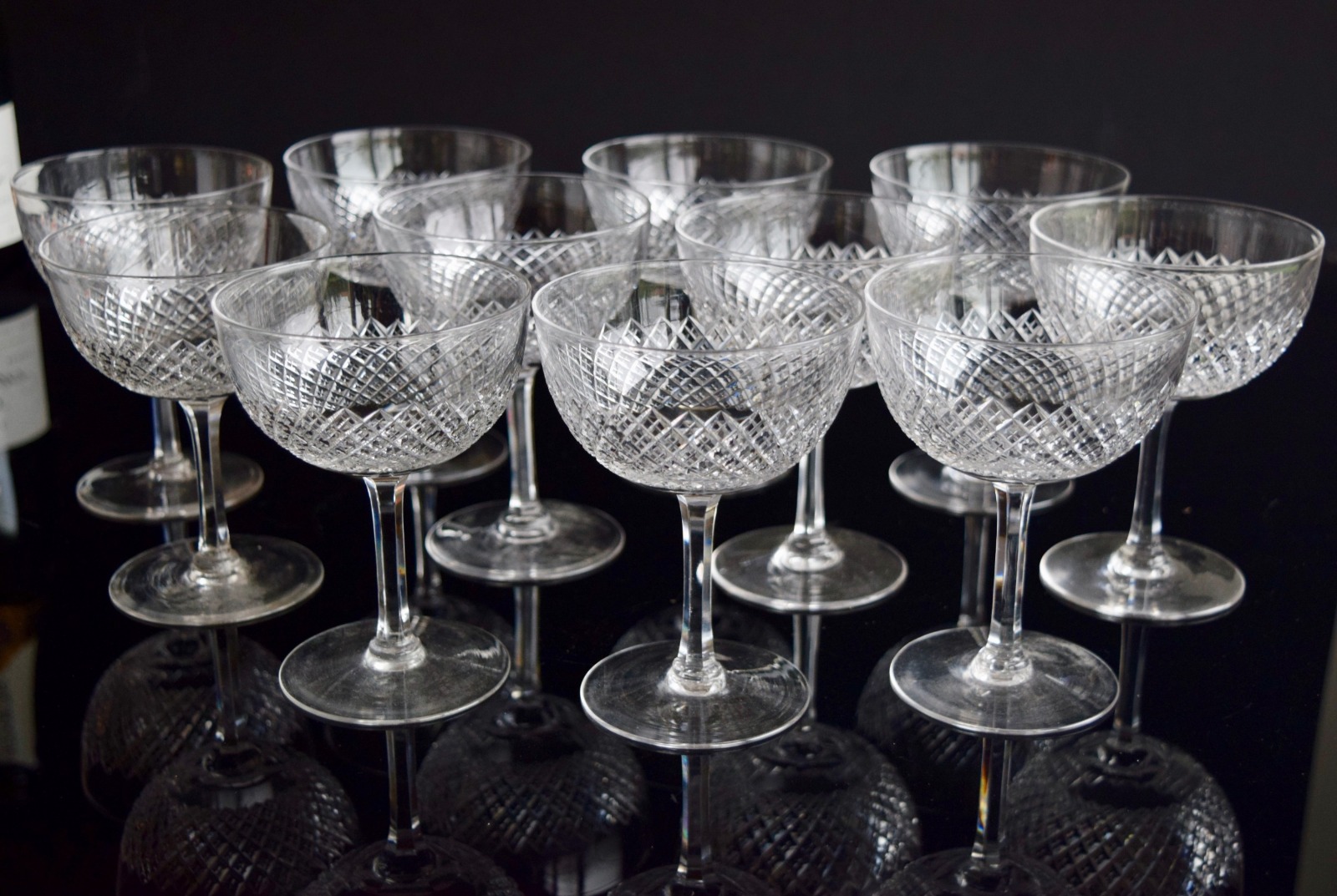 10 Edwardian Champagne Glasses Diamond & Cross Pattern