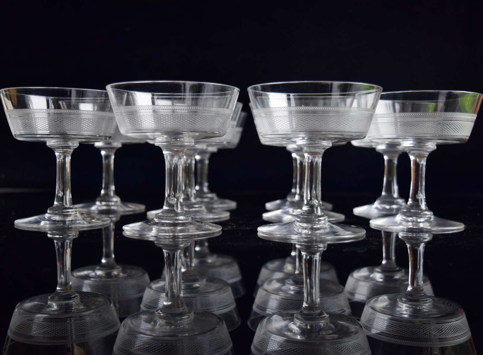 12 Belle Epoque French Crystal Champagne Glasses Needlepoint Etched