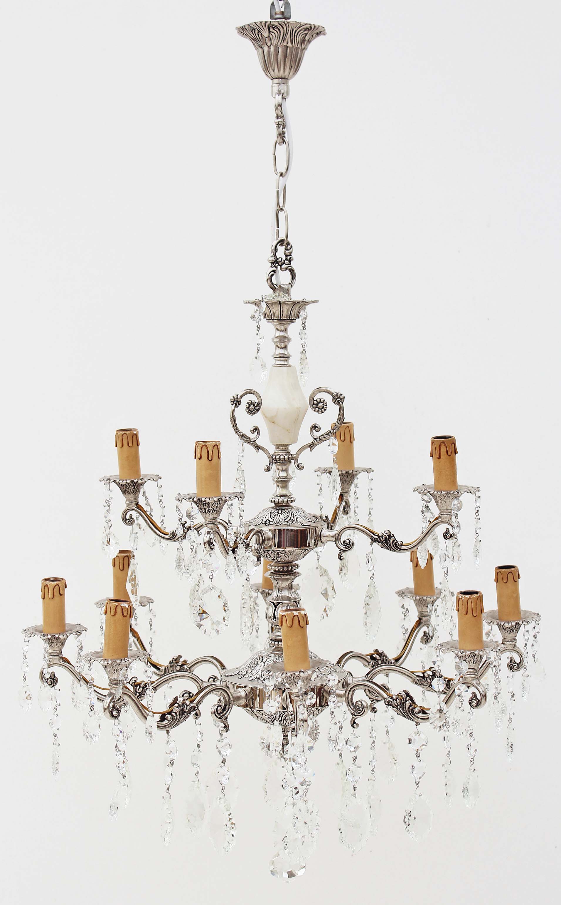 12 Lamp Silver On Brass Crystal Chandelier C.1930