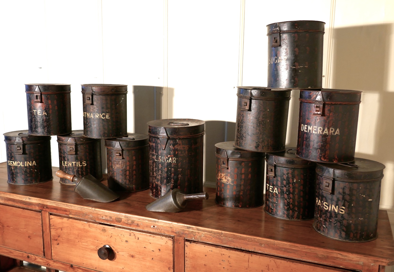 12 Large Victorian Grocers Tolewear Canisters & Tins with Scoops