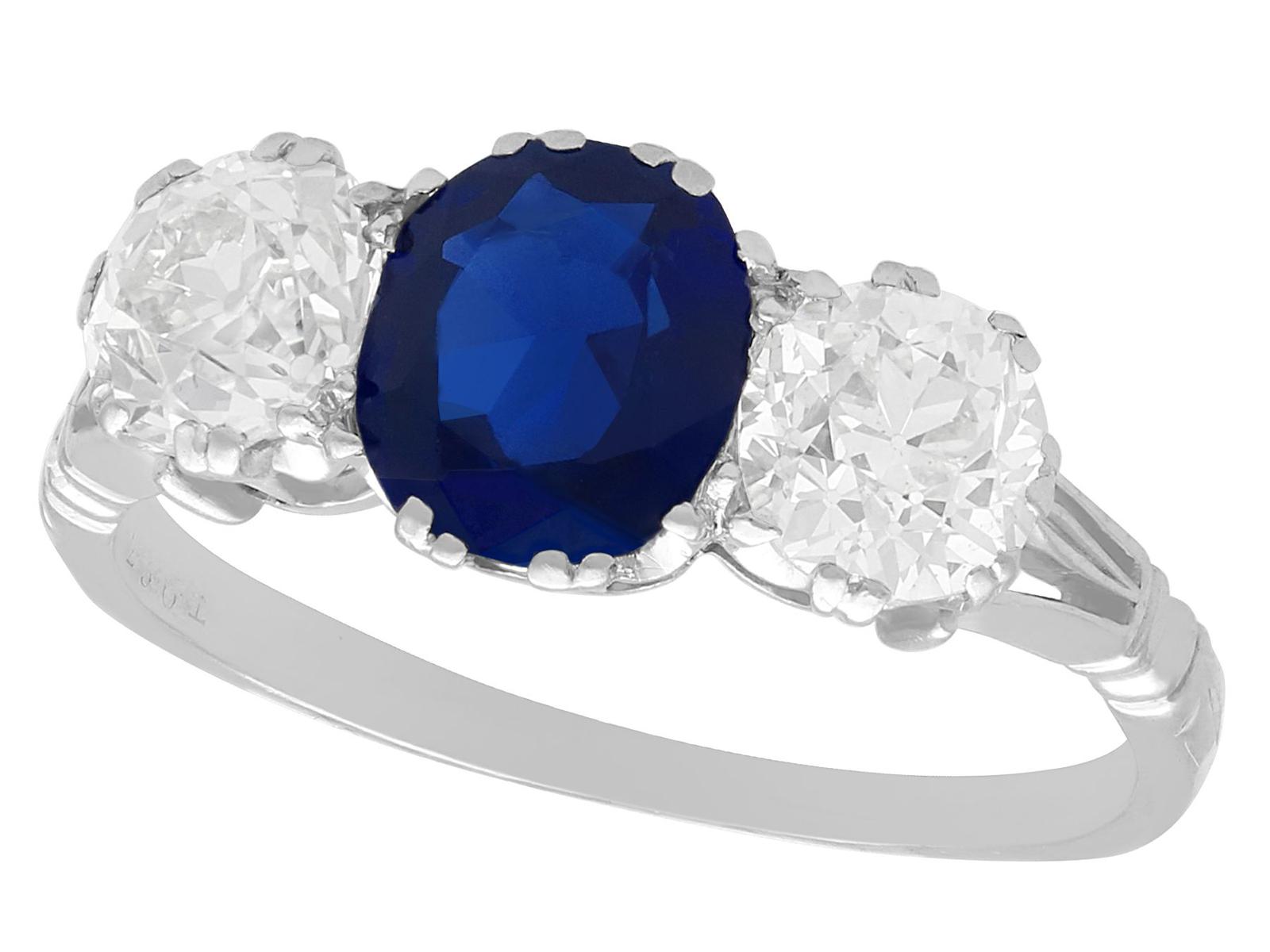 1.40ct Burmese Sapphire & 1.38ct Diamond, Palladium Trilogy Ring - Vintage c.1940 (1 of 12)