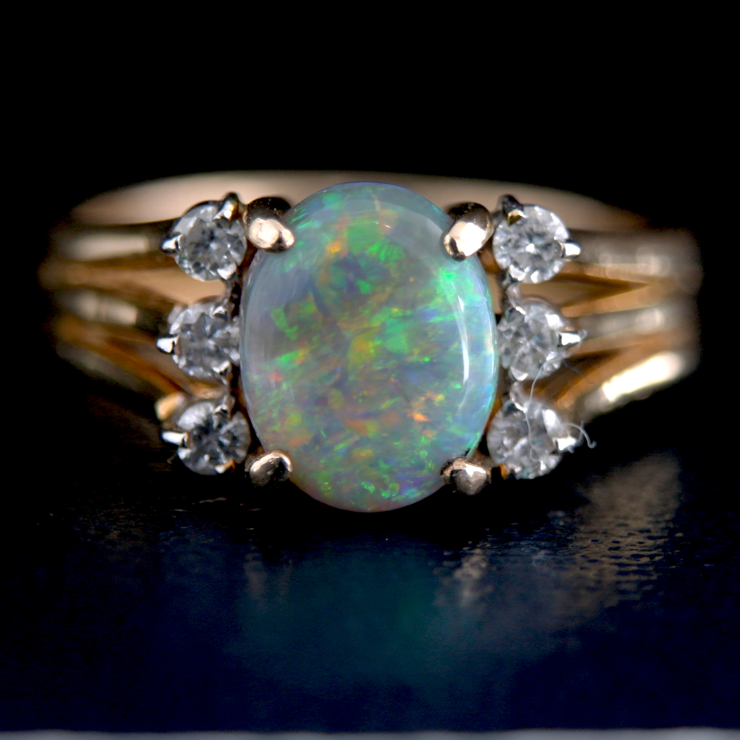 14K Gold Opal and Diamond Ring size 7.25 14ct Yellow gold Australian Crystal opal cabochon