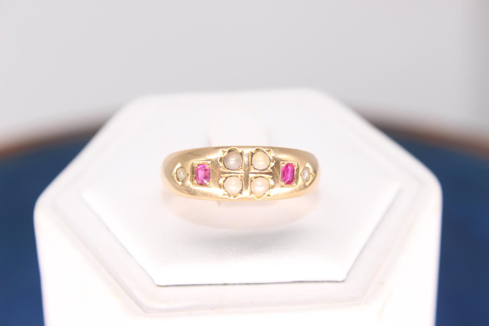 15ct 1845 Ruby & Pearl ring, Size Q, Weighing 4.2g