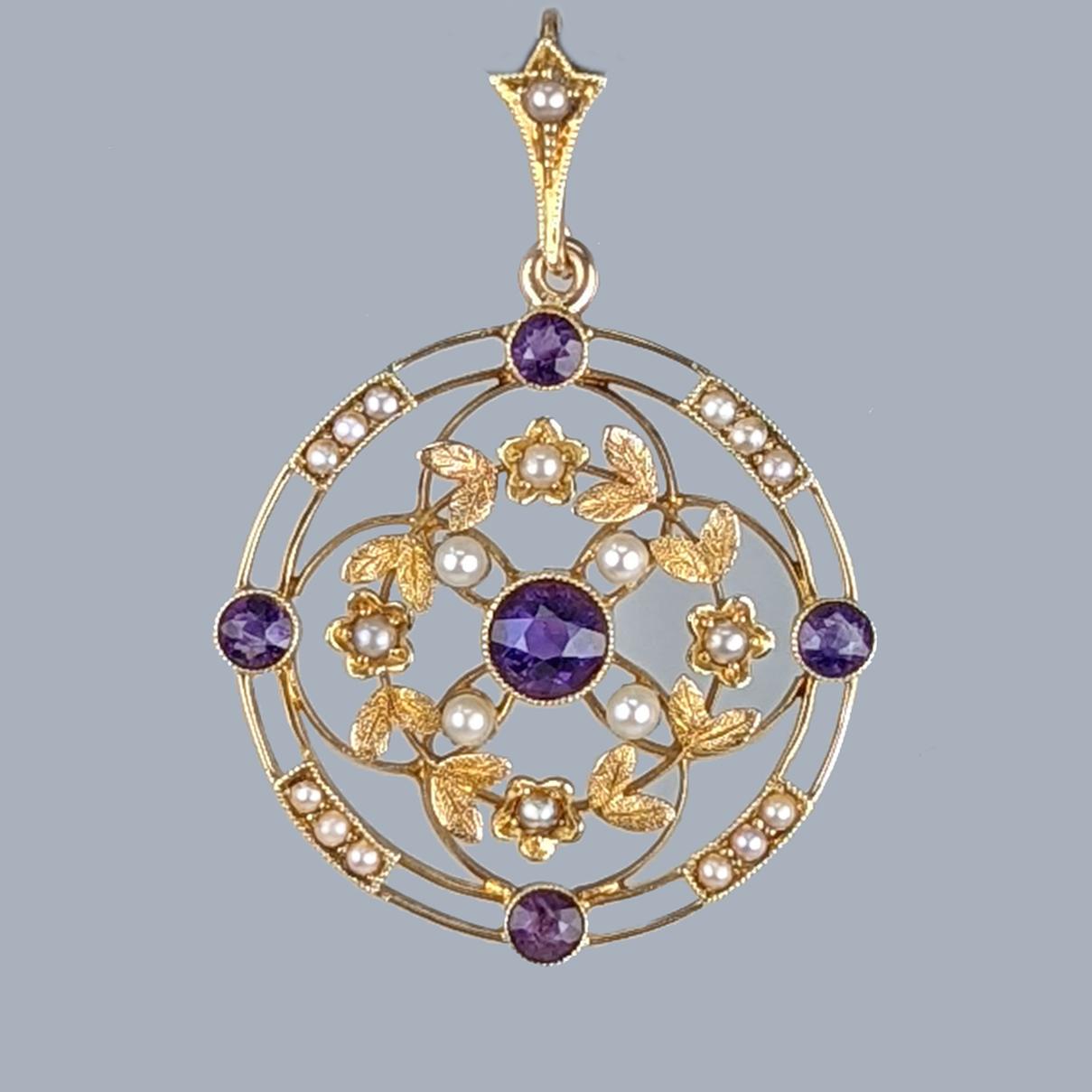 15ct Gold Amethyst & Pearl Pendant Antique Foliate Pendant Edwardian c.1905 (1 of 6)