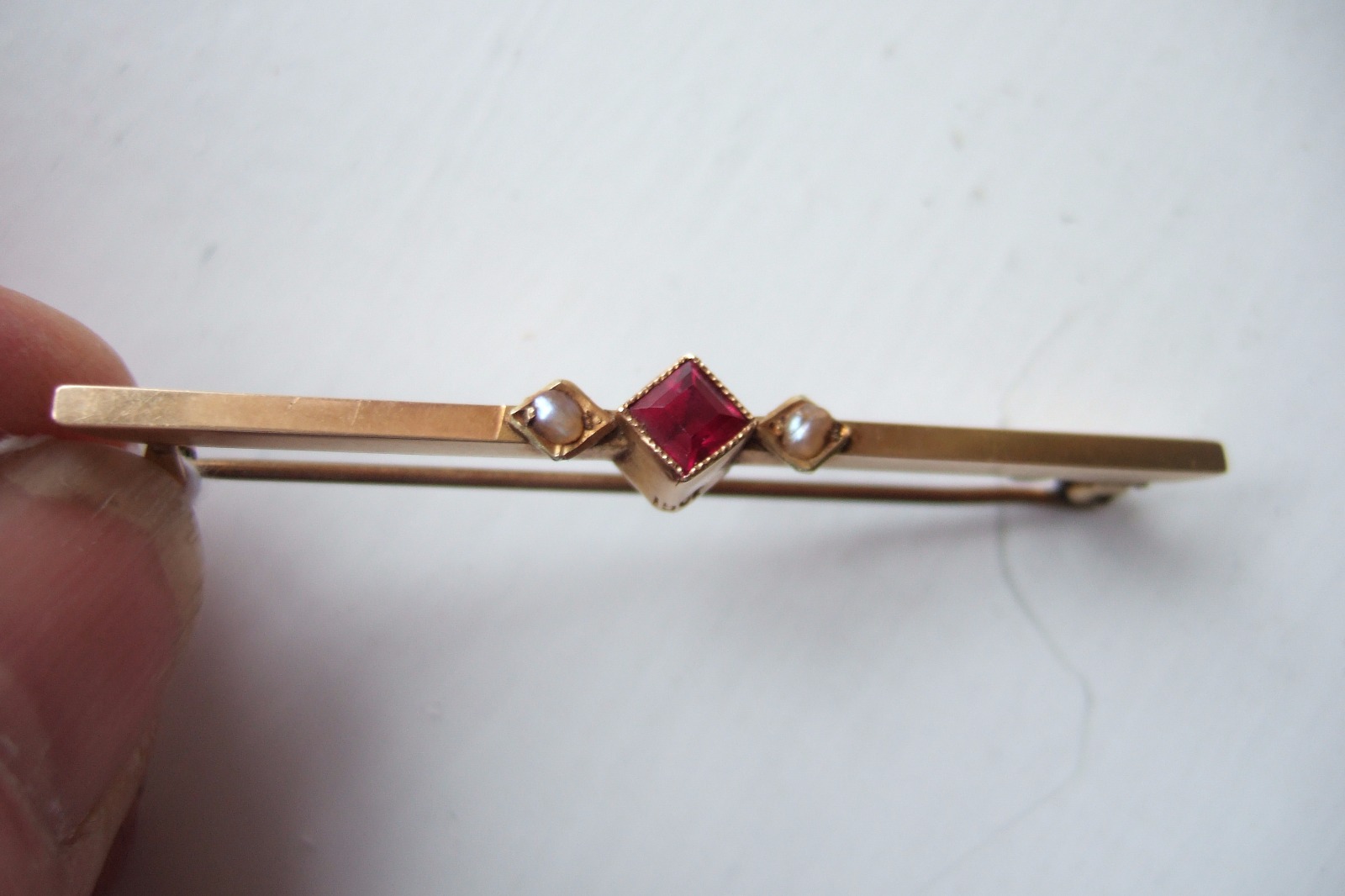 15ct Gold Bar Brooch Inset with Ruby & Seed Pearls (1 of 1)