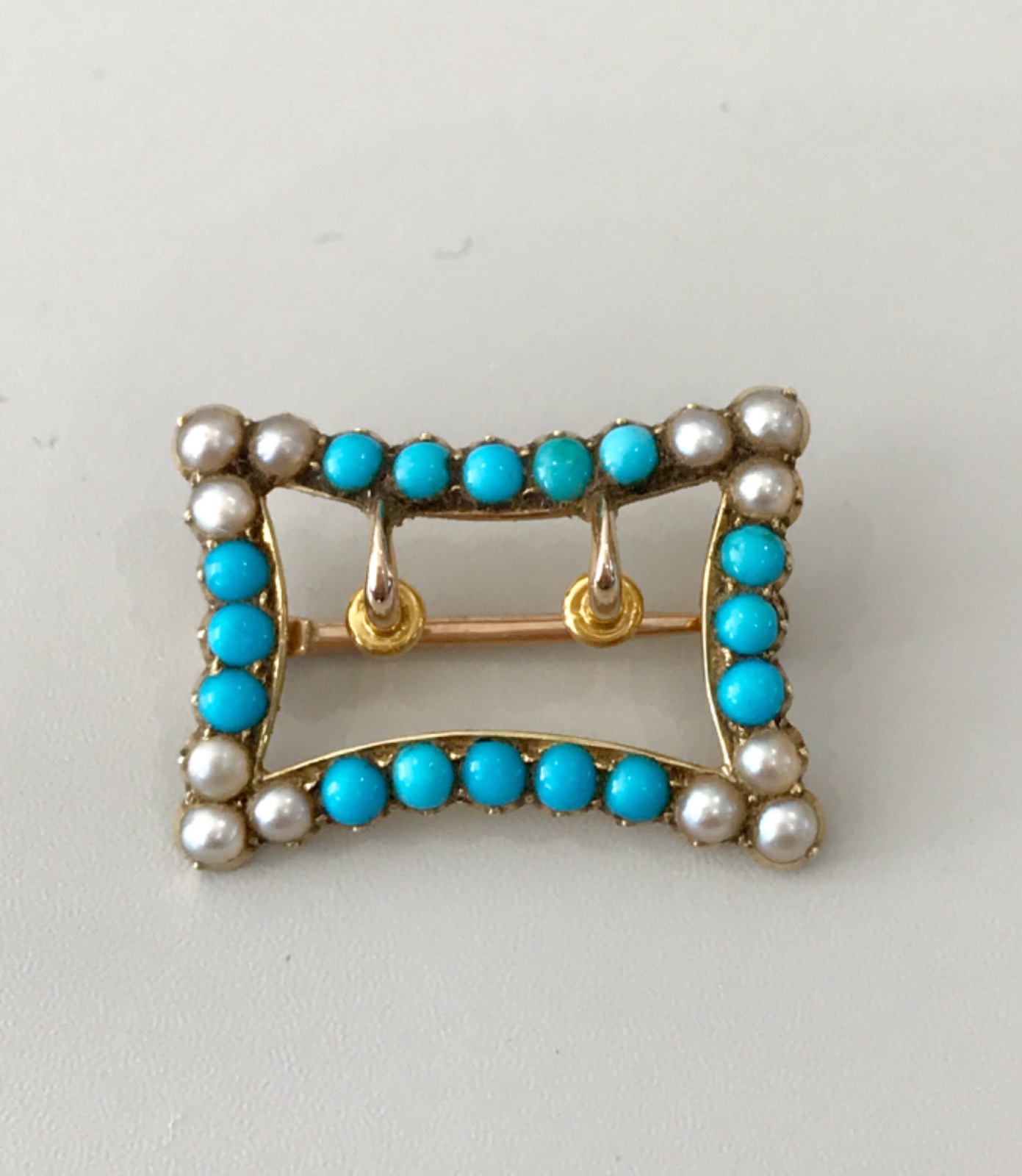 15ct Gold Turquoise & Seed Pearl Buckle Brooch