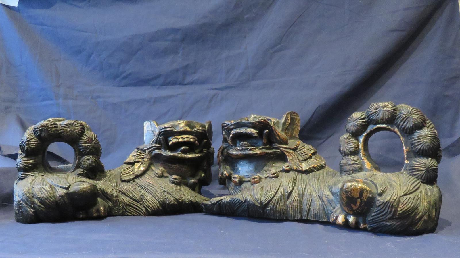 16" Wide Antique Temple Dogs Fo Dogs Hand Carved T