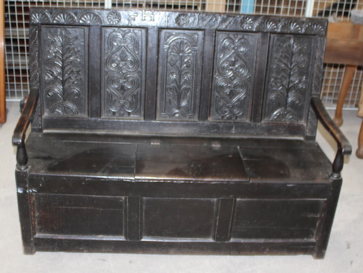 1717 Dark Oak Large Carved Monks Bench with Lift Up Lid