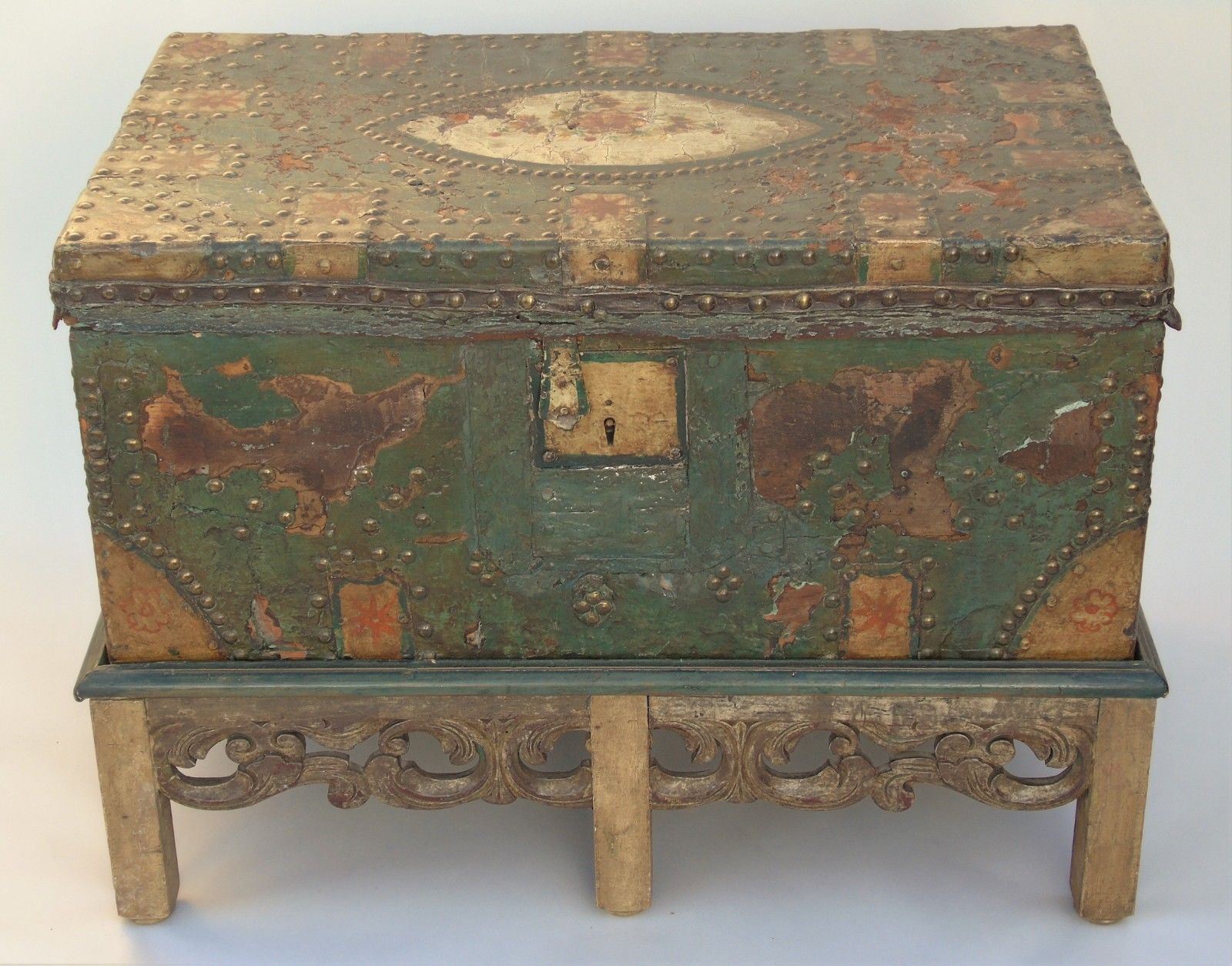17th Century Hand Painted Leather Chest On Stand (1 of 11)