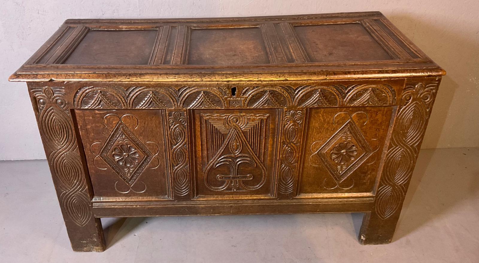 17th Century Oak Blanket Box All Original Rare Carved Panel