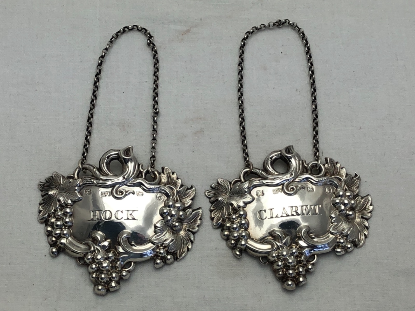 1840 Antique Pair of Solid Silver Wine Label Tickets Claret & Hock