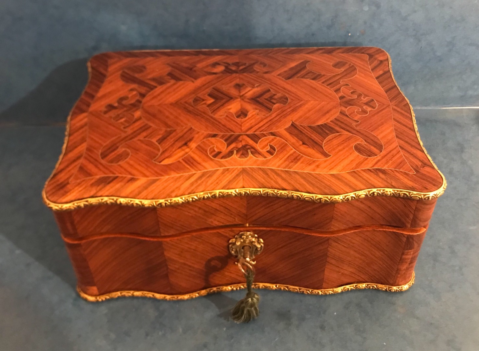 1850 French Brass Edged and Brass Inlaid Angle Cut Tulip Wood Box