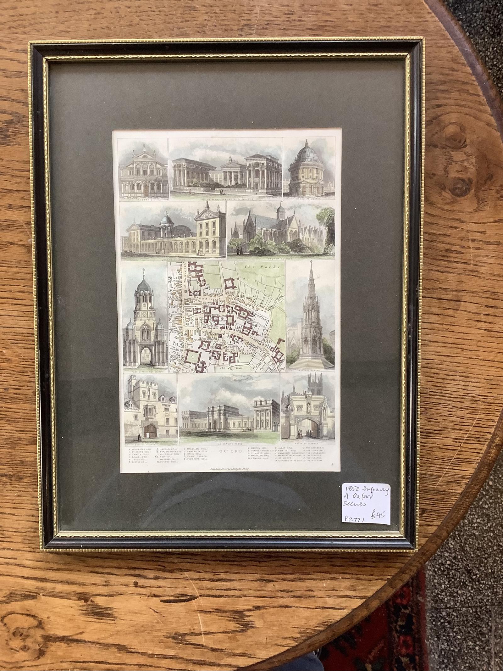 Probably originally conceived as a tourist piece for visitors to Oxford, this engraving shows a number of colleges etc in Oxford, plus a central map of the city with a numbered guide to the sights. Still useful!