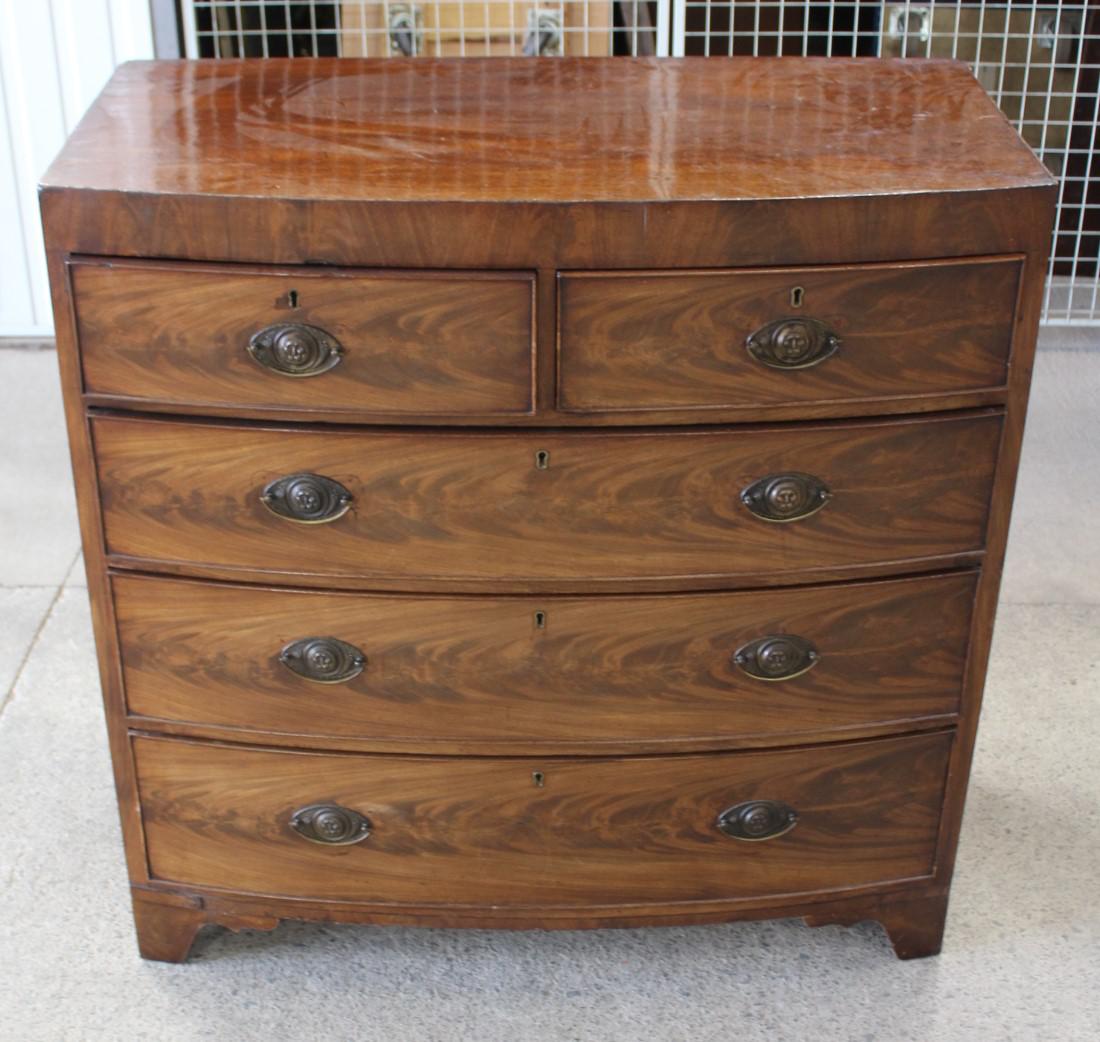 1880's Mahogany Bow Chest Drawers with Flame Veneer on the Drawers