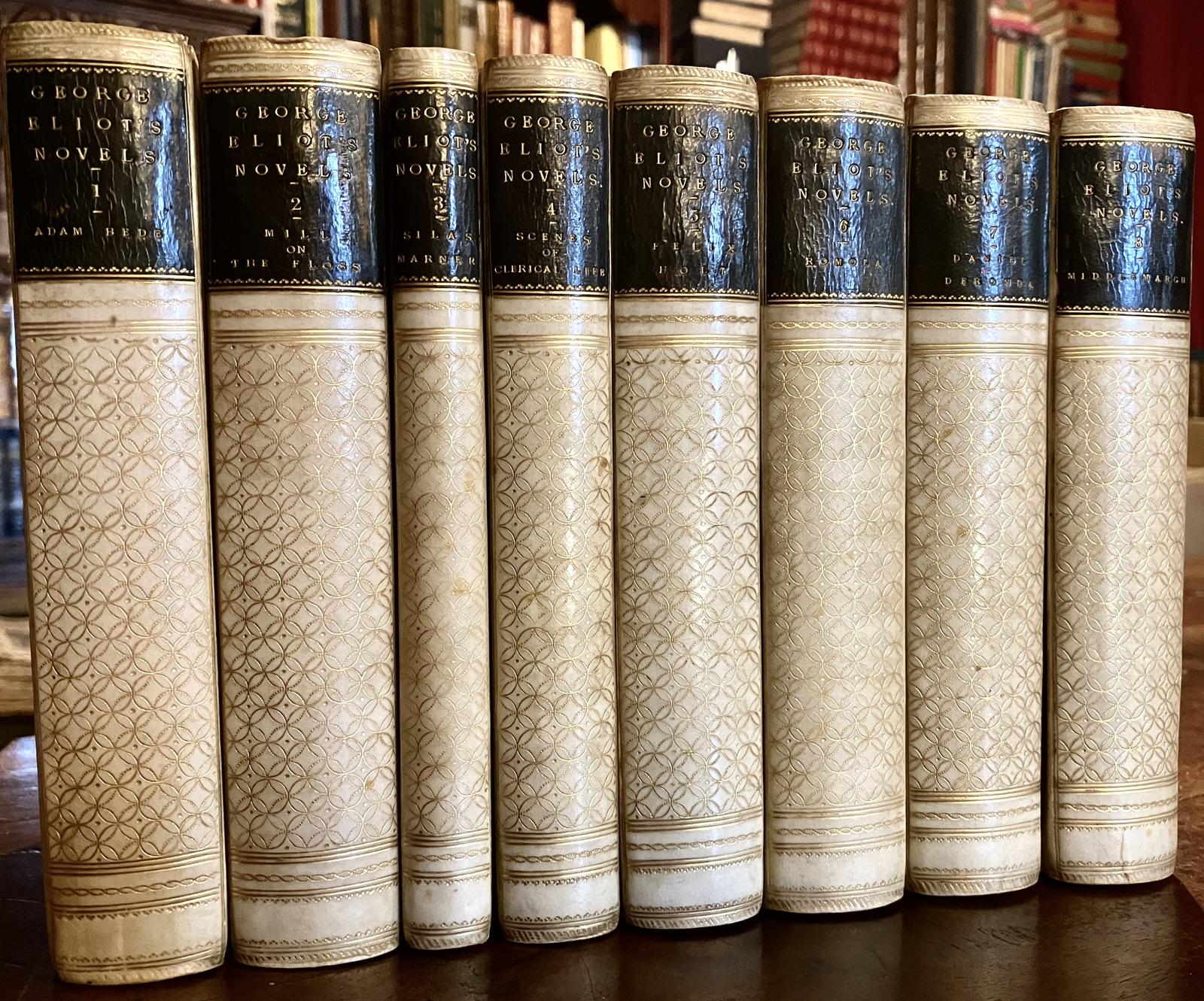 1880's The Works of George Eliot 8 X Volume Set in Fine Vellum & Gilt Bindings