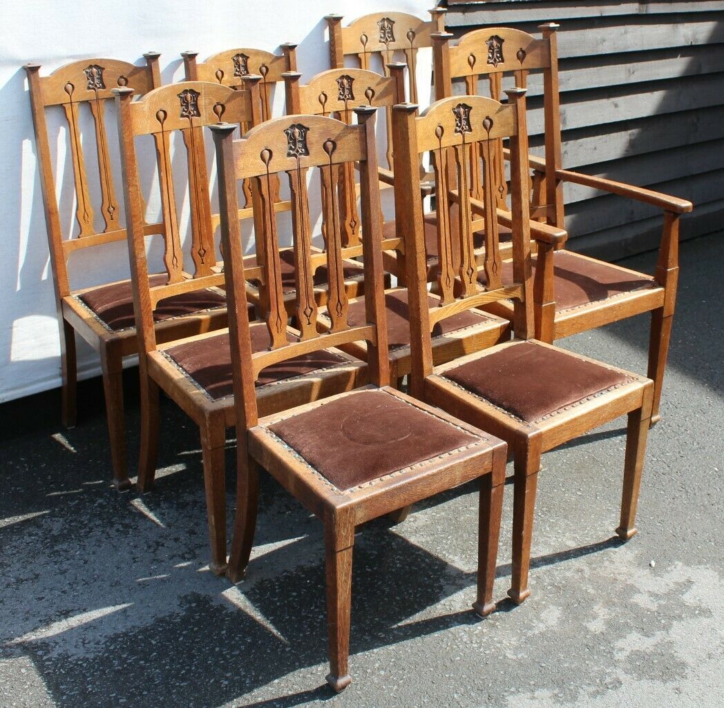 1890s Set 8 Oak Art Nouveau Dining Chairs 6 +2 Carvers