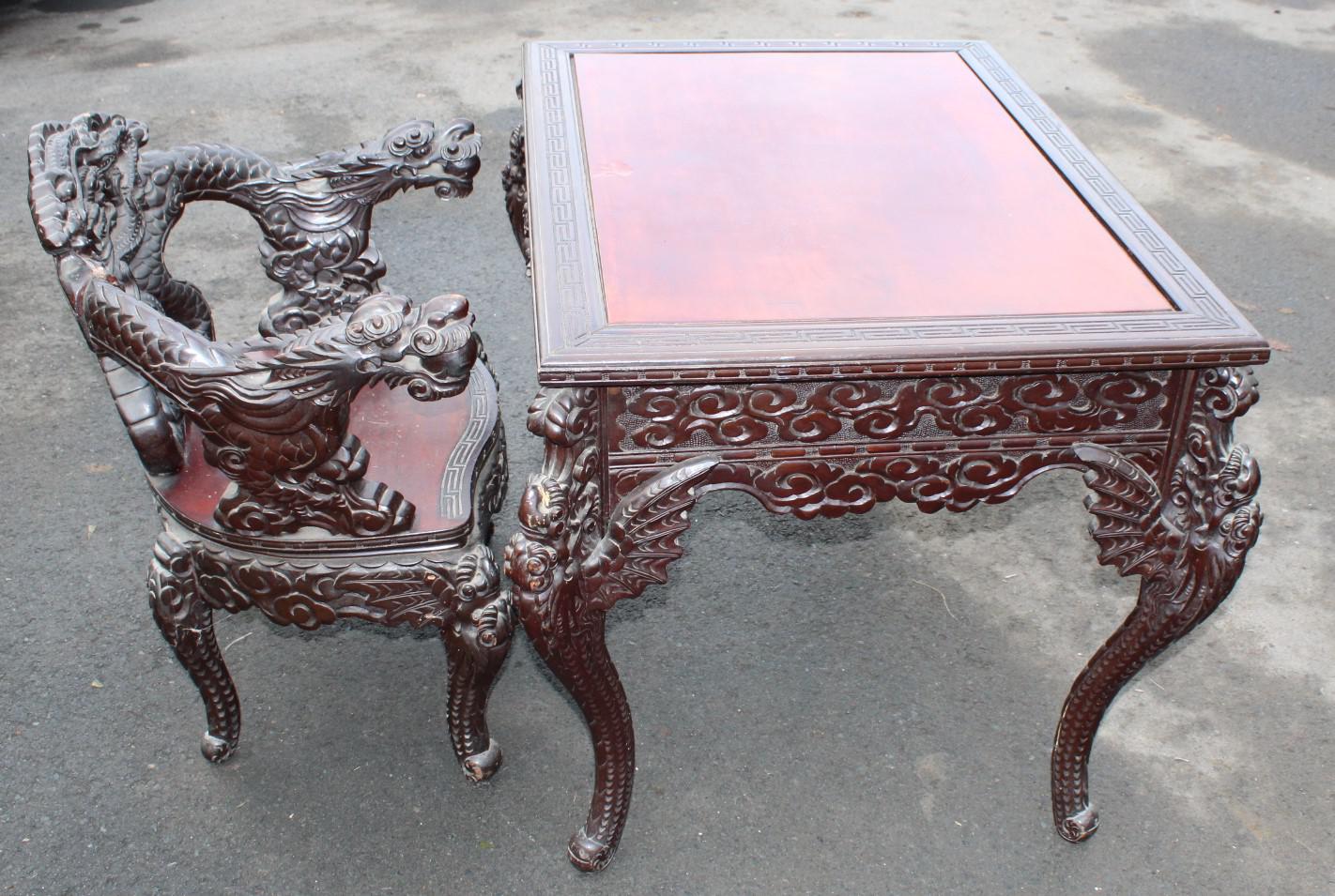 1890s Well Carved Hardwood Chinese Matching Desk & Armchair Red Top