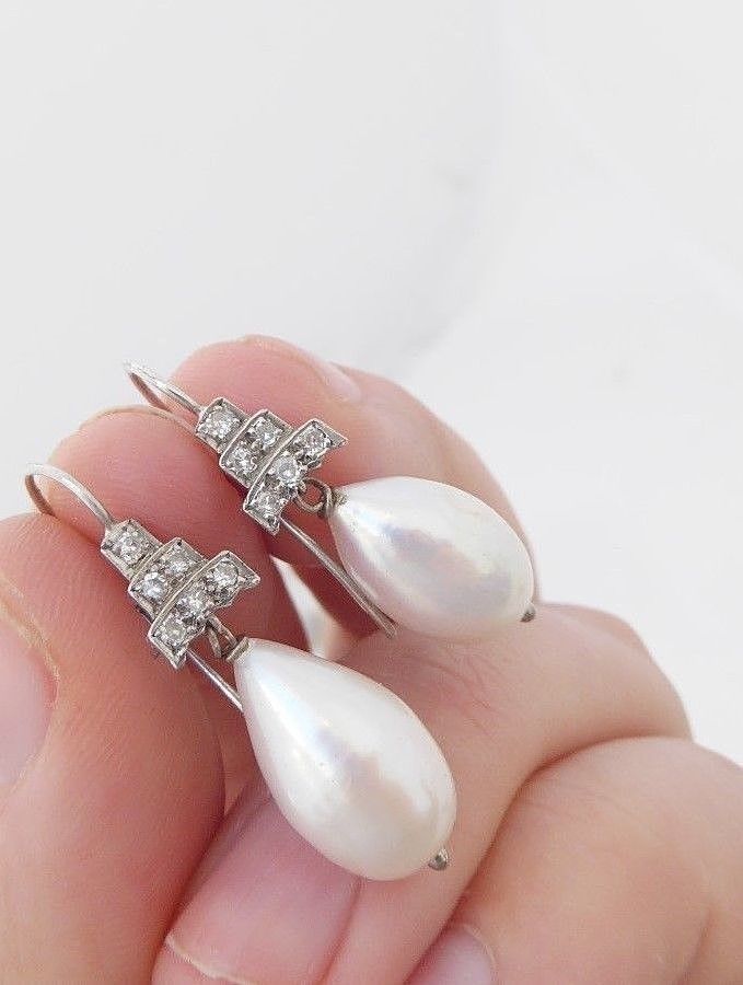 18ct / 18K White Gold Diamond & Baroque Pearl Art Deco Drop Earrings