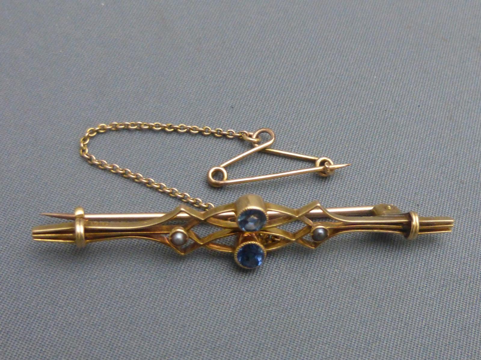 18ct gold, Ceylon sapphire & grey seed pearl brooch