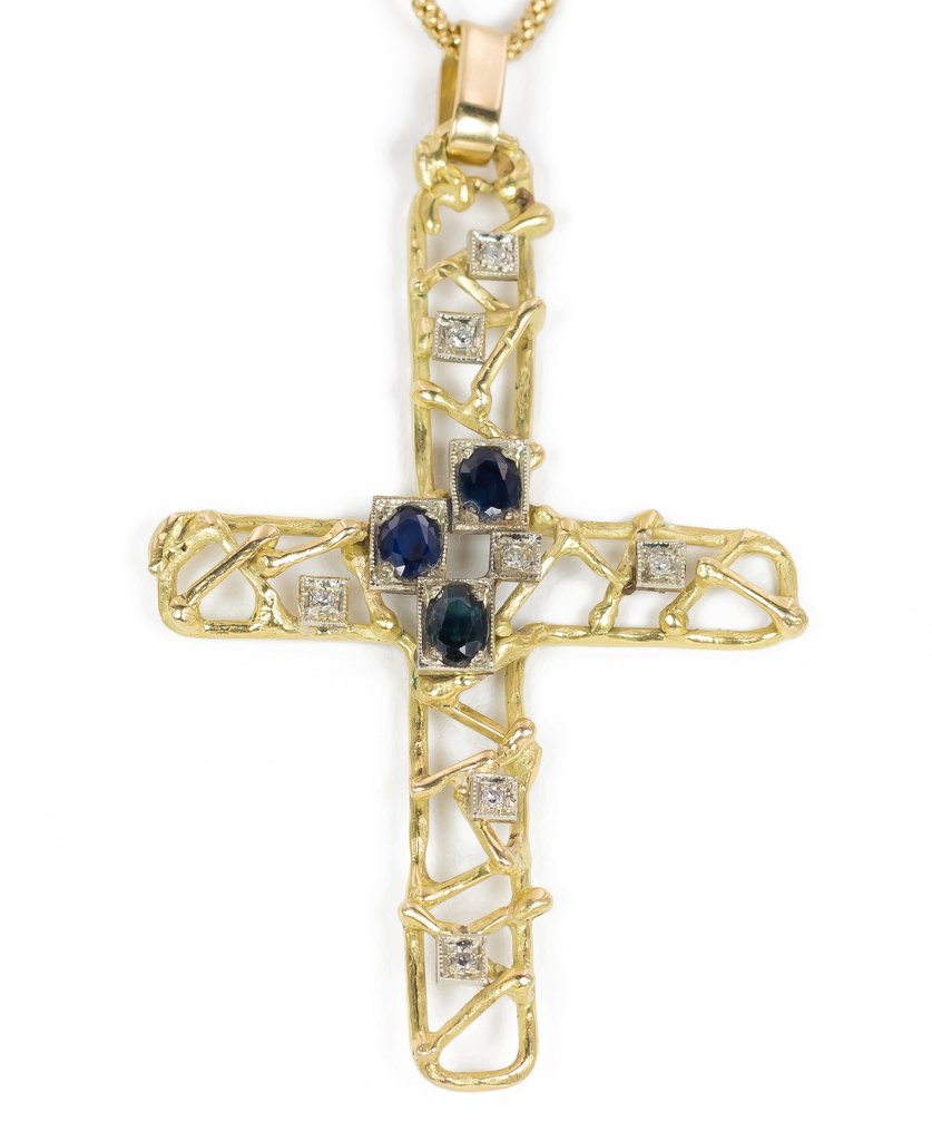 18K Gold, Diamond & Sapphire Crucifix Pendant, 1970s
