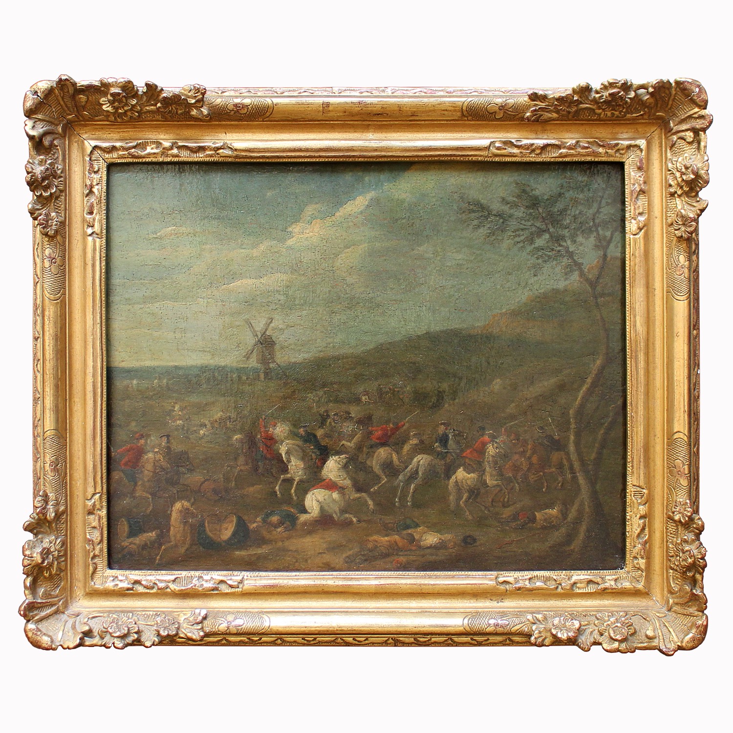 18th Century Battle Scene with Windmill, Antique Flemish Oil Painting