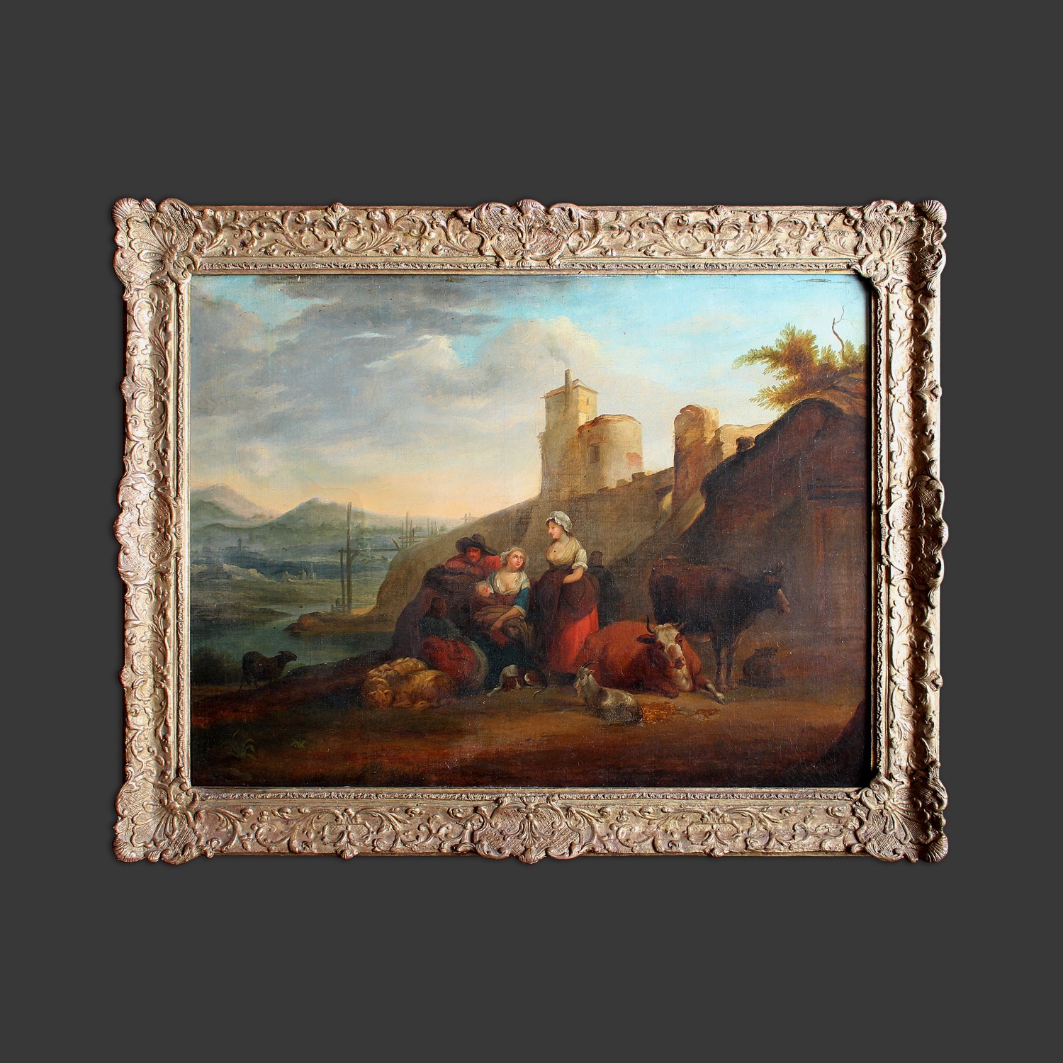 18th Century Classical Landscape with Peasant Family, Antique Oil Painting