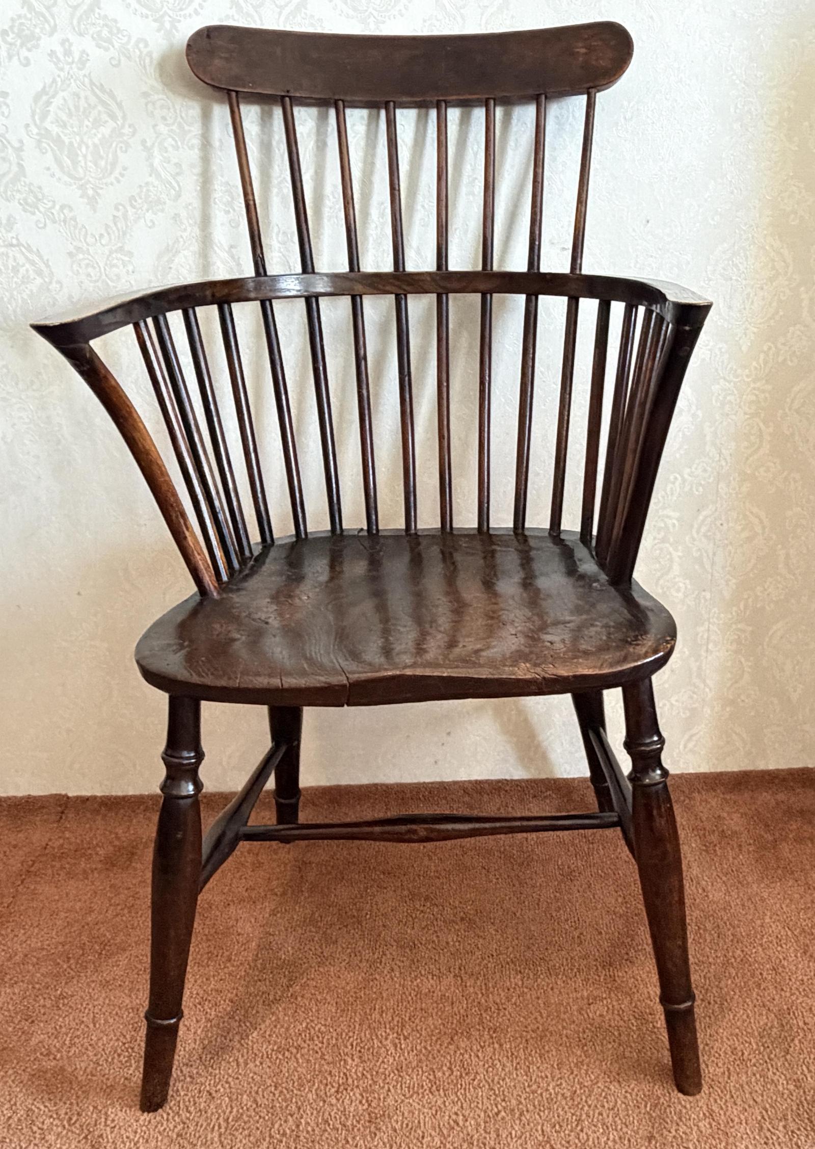 This 18th Century comb-back Windsor chair is crafted from ash wood and dates to approximately 1780. The chair features a comb back design, typical of Windsor chairs from this period. It is representative of 18th-century craftsmanship and design.