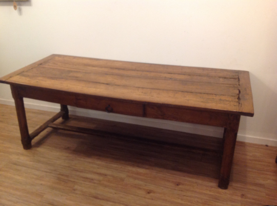 18th Century French Charantese Charente Solid Walnut Farmhouse Kitchen Table On H Stretcher with 2 Drawers