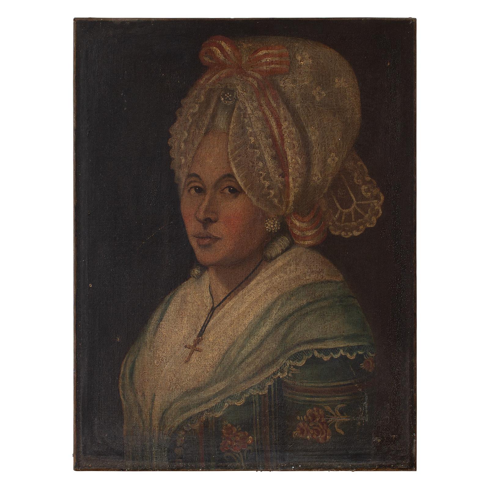 18th-Century French School Portrait of Lady with Bonnet, Oil Painting