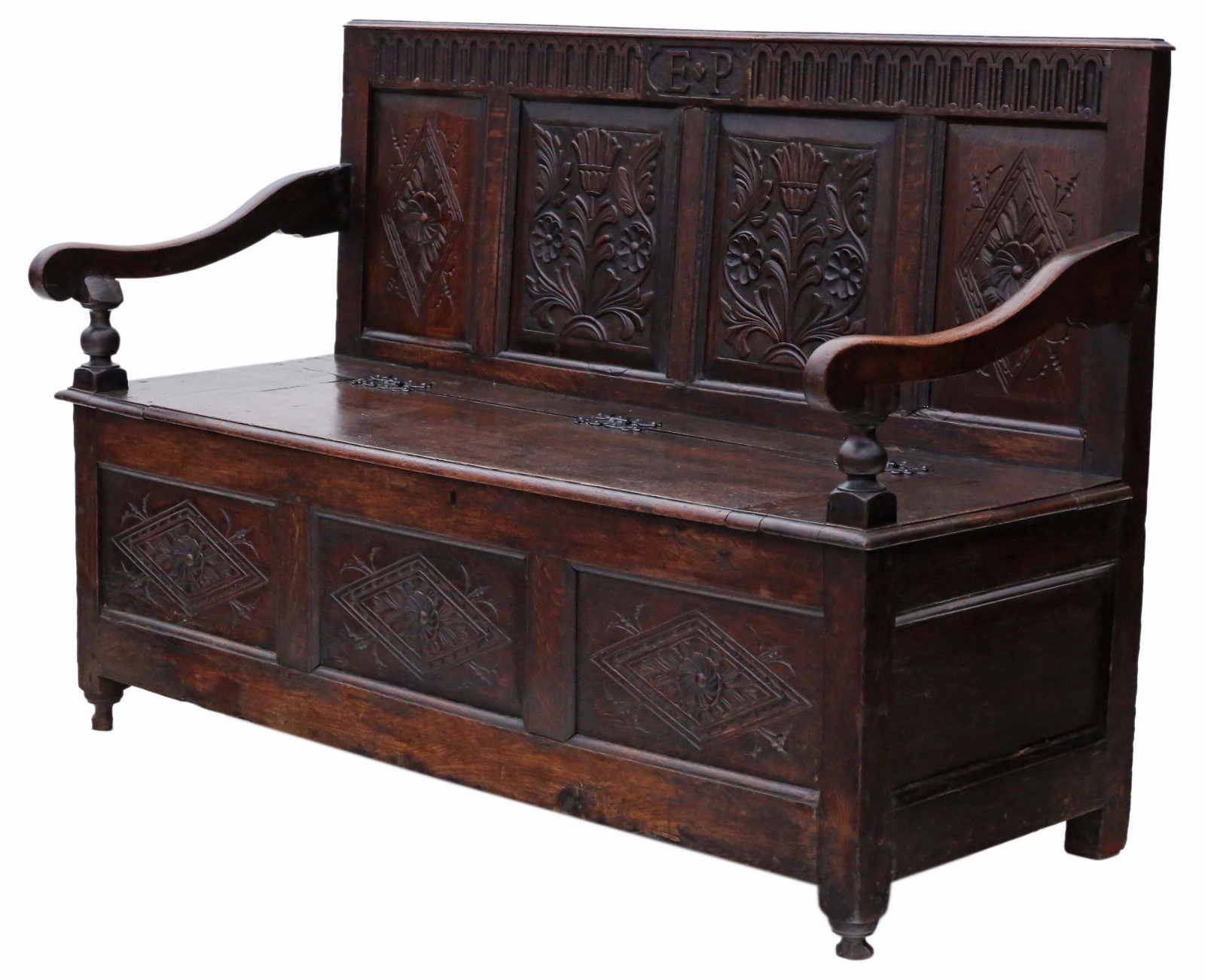 18th Century Georgian Carved Oak Settle Coffer Bench Seat (1 of 1)