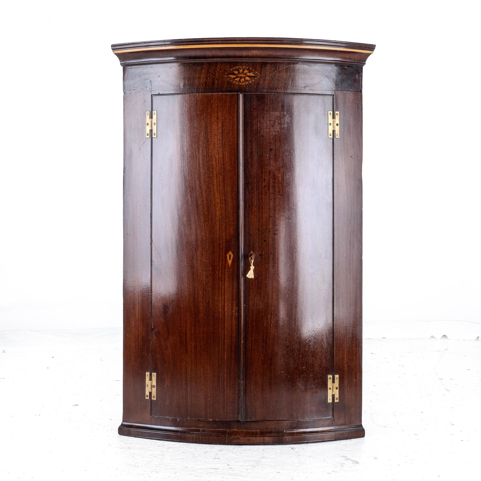 18th Century Georgian Mahogany Inlaid Bow Front Corner Cabinet Wall Mounted