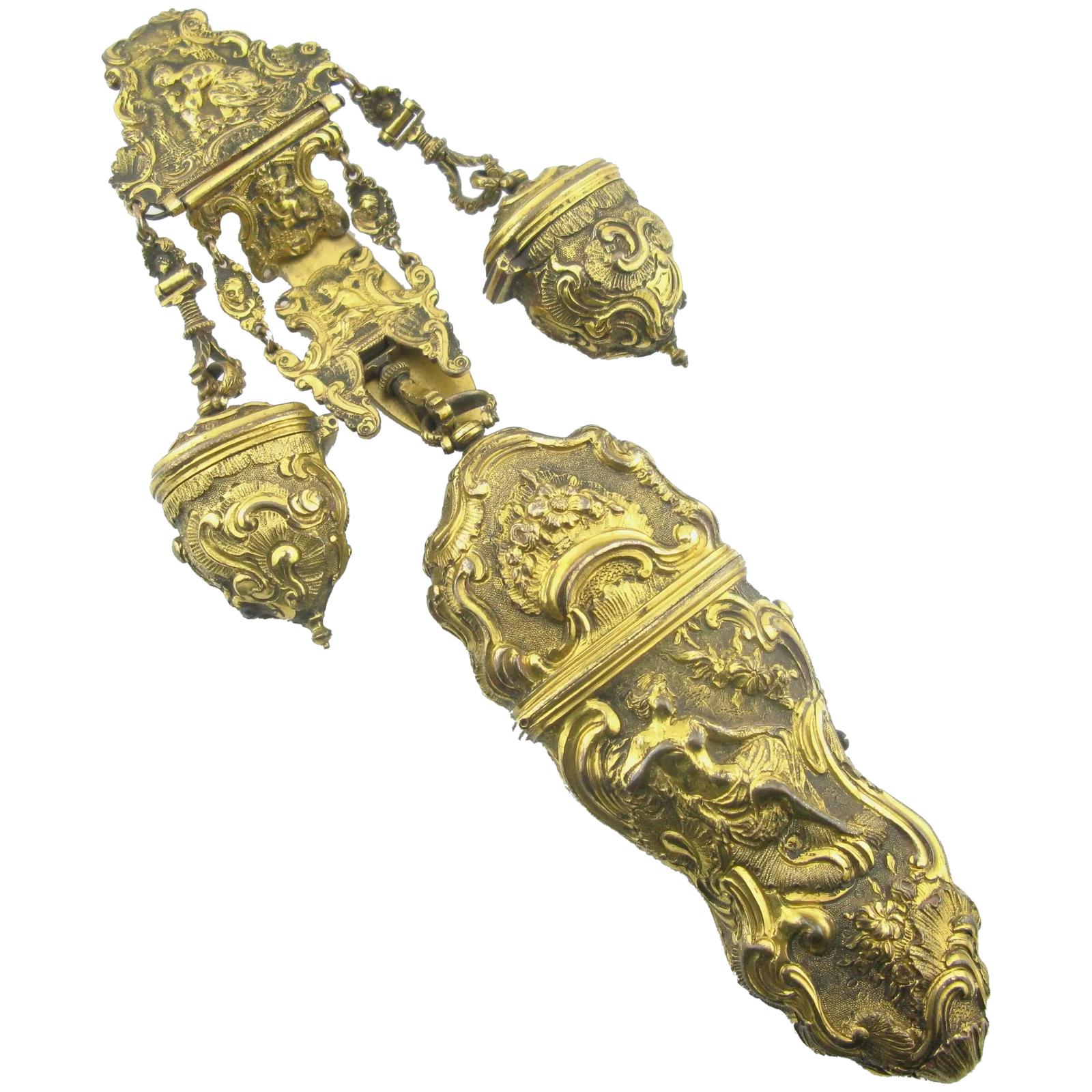 18th Century Gilt Metal Chatelaine with Etui and Thimble Holders
