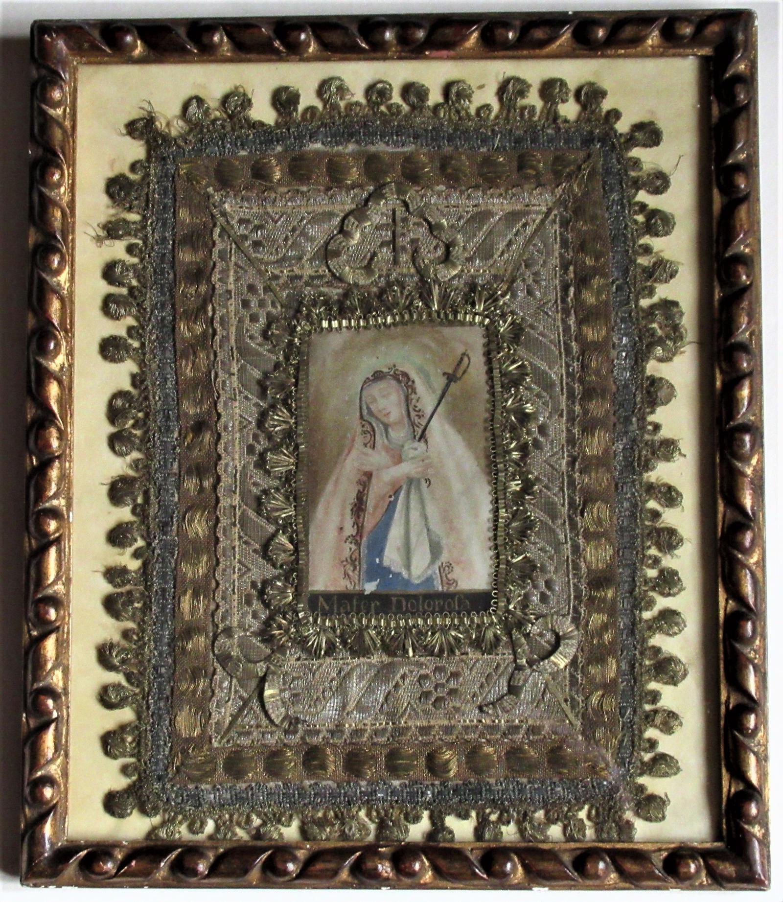 18th Century Gold and Silver Thread Embroidery with Painting of Mater Dolorosa, Period Frame