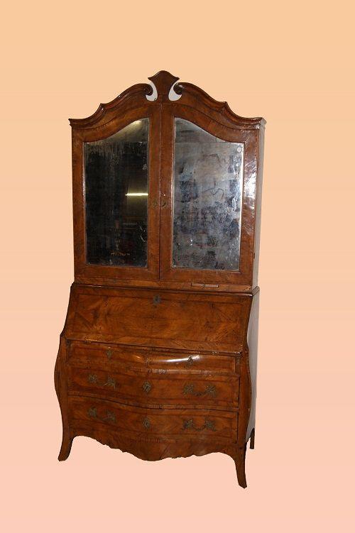 18th Century Italian Antique Bureau Bookcase Veneered in Walnut