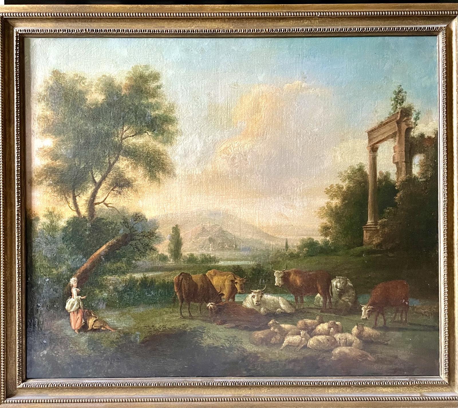 18th Century Italian School. Expansive Open Landscape with Cattle and Ruin and Lake Beyond; Oil on Canvas