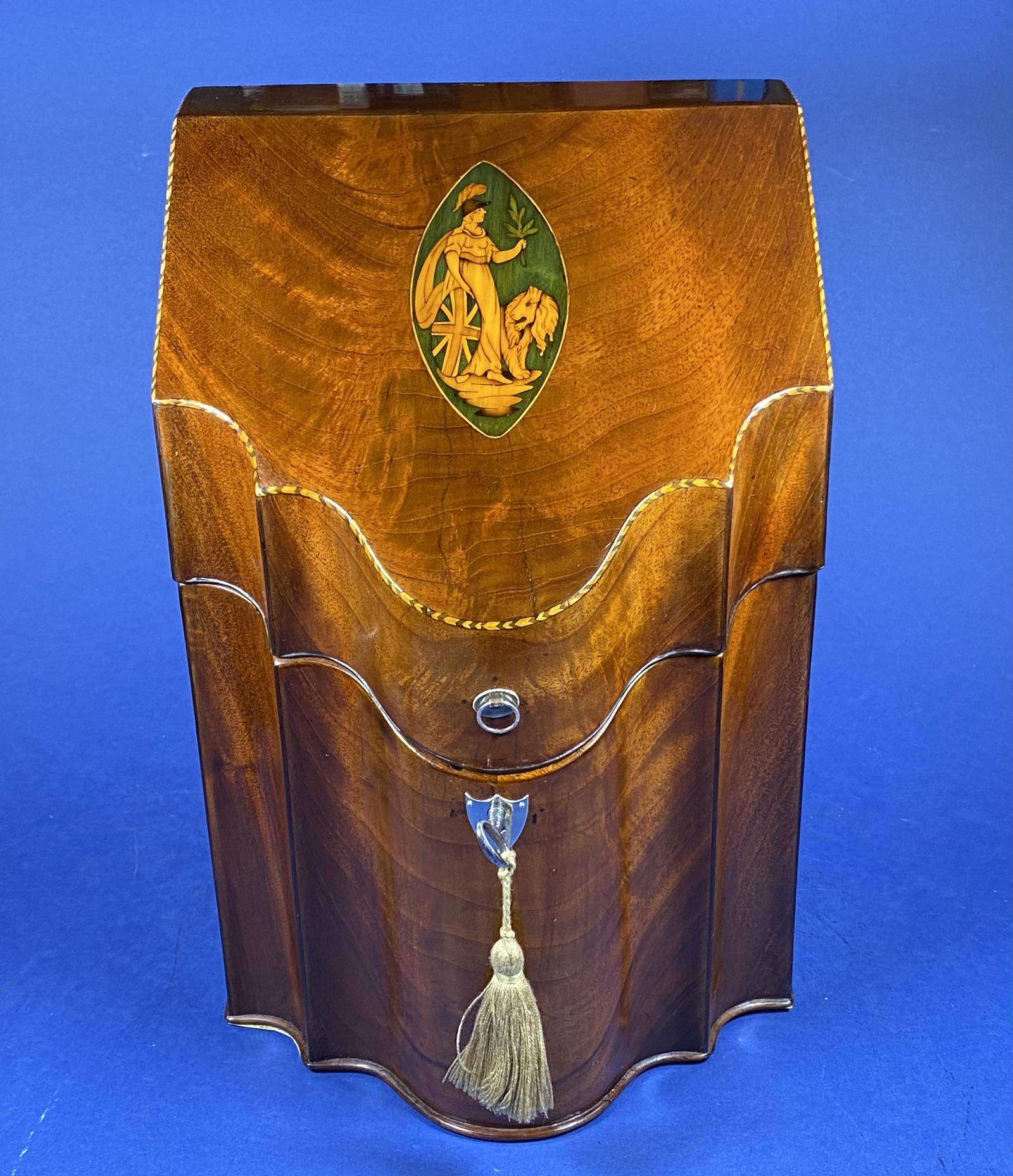 18th century mahogany fitted knife / cutlery box with a harewood Britannia inlaid panel to the lid