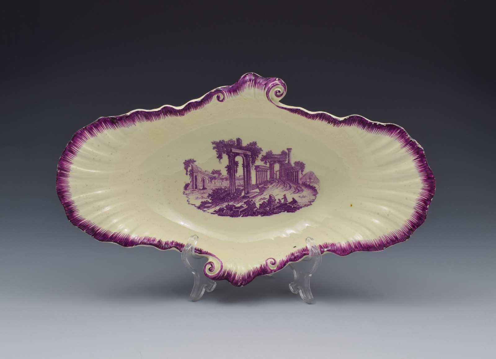 18th Century Neale & Co. Creamware Shell Dessert Dish Puce Classical Ruins