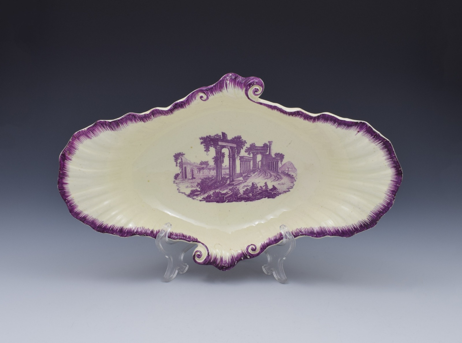 18th Century Neale & Co. Creamware Shell Dessert Dish Puce Classical Ruins
