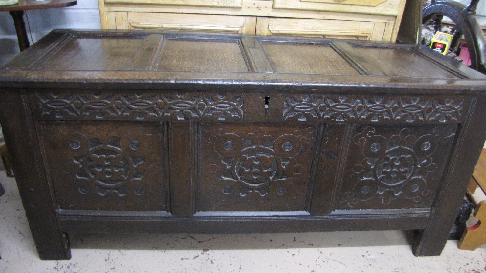 18th Century Oak Carved Coffer - Carved Front Panels & Frieze