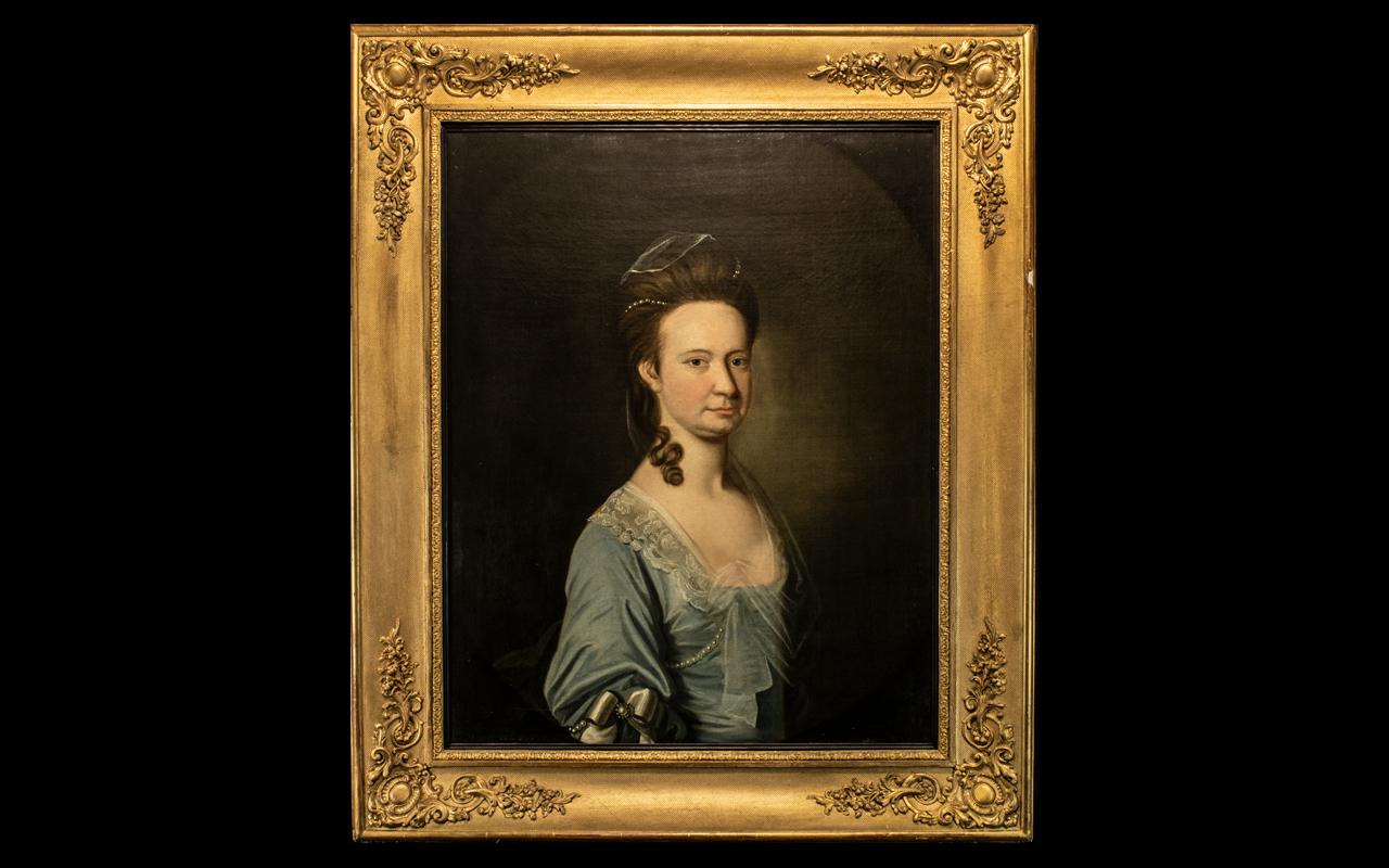 18th Century Oil Painting of an Elegant Lady in a Blue Silk Dress