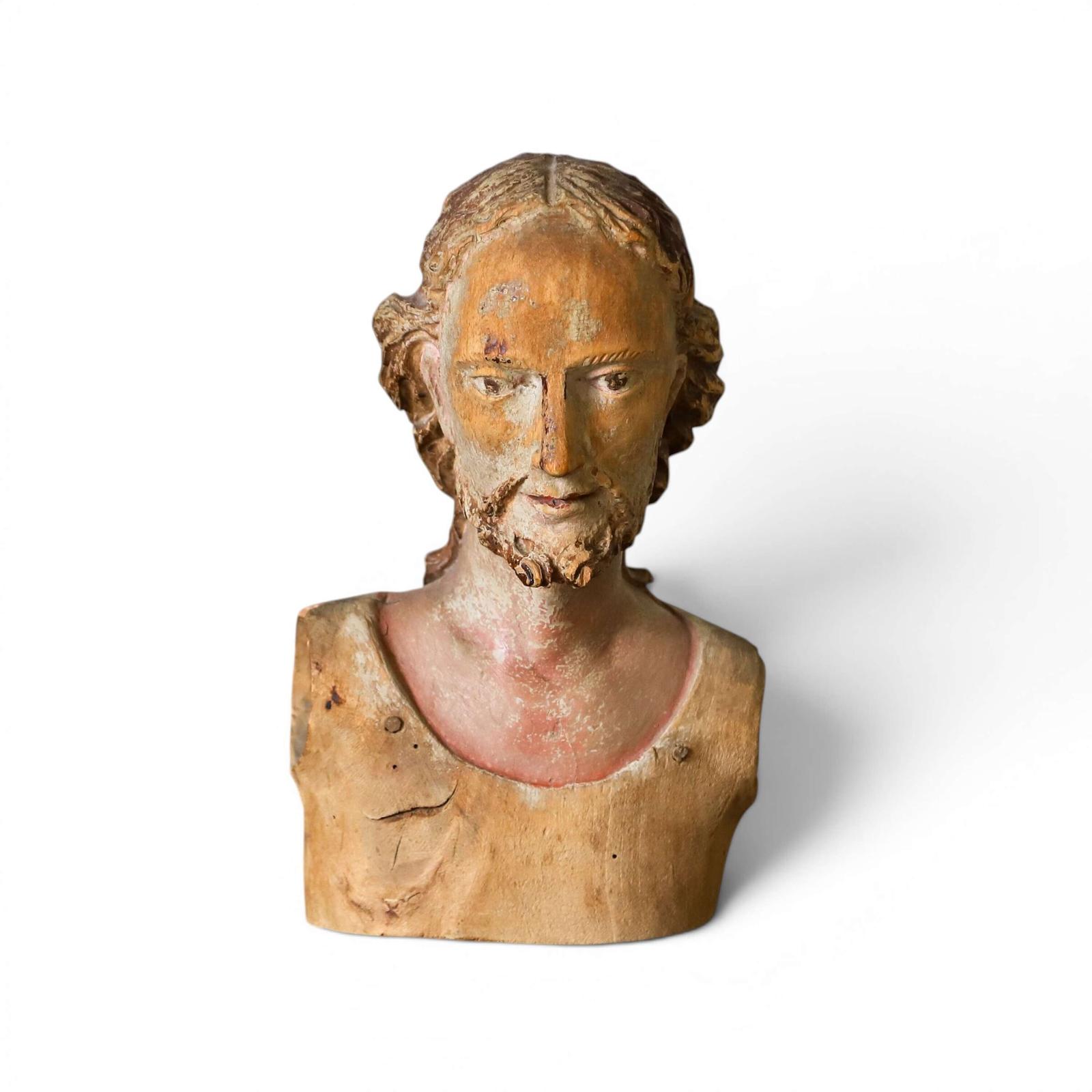 An 18th‑century carved and polychrome olive wood bust of Christ, likely Italian and possibly Sicilian. Finely modelled with traces of original paint, this devotional head retains a moving sense of presence. With age‑related wear, cut marks and historic worming, it stands as an evocative survivor of early religious craftsmanship.