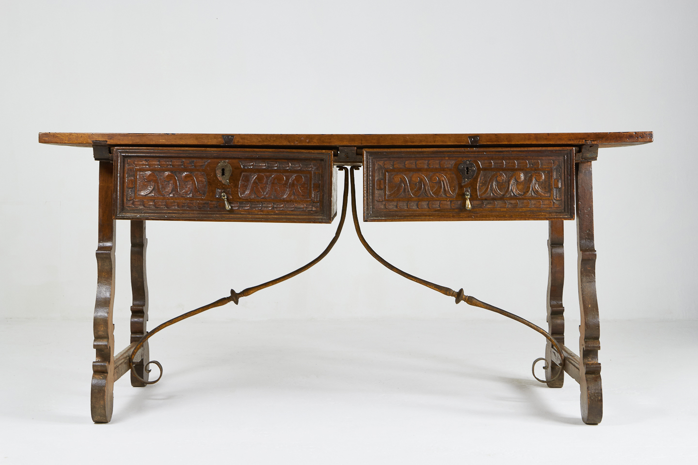 18th Century Spanish Walnut Trestle Table & Iron Stretcher
