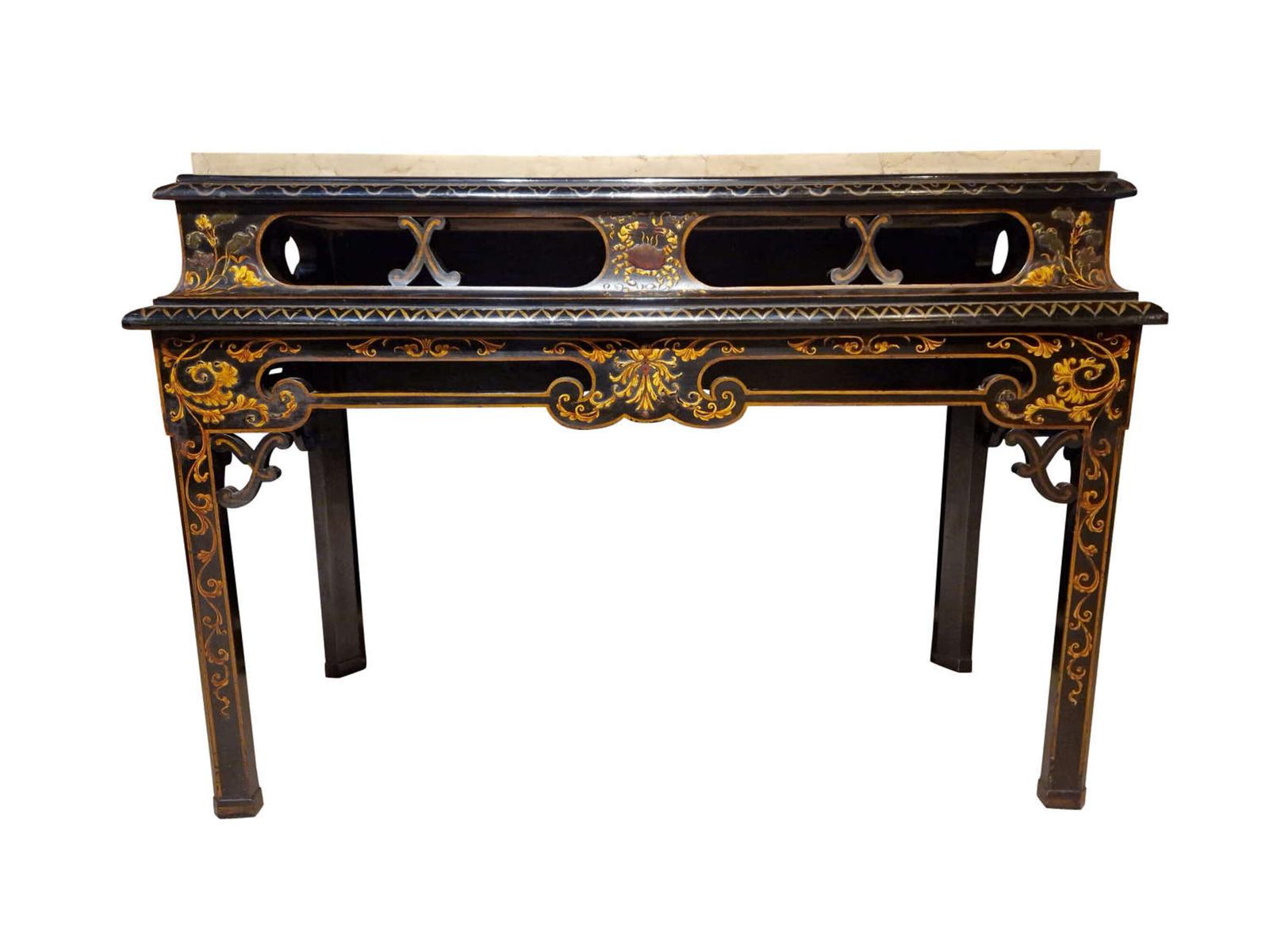 Salisbury Antiques Centre has clarified that the 18th-Century Style Black Lacquered Console Table with Marble Top (LA544364) is genuinely of the period declared with the date/period of manufacture being circa 1880