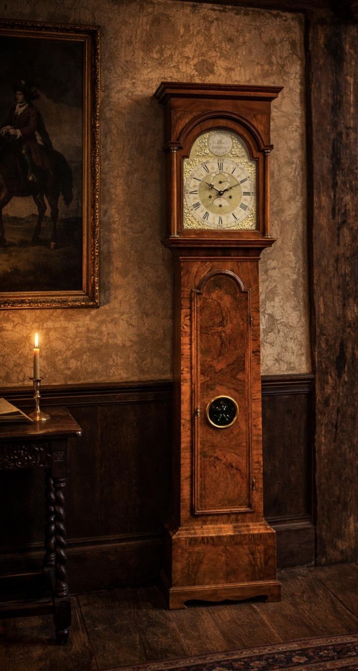 A fine George III Walnut long case clock, 30.5cm arched brass dial with silvered roundel inscribed Robt Jackson Gainsborough, silvered chapter ring with Roman and subsidiary Arabic numerals, subsidiary seconds dial, date aperture, eight day movement striking on a bell, the case with lenticle to door.
