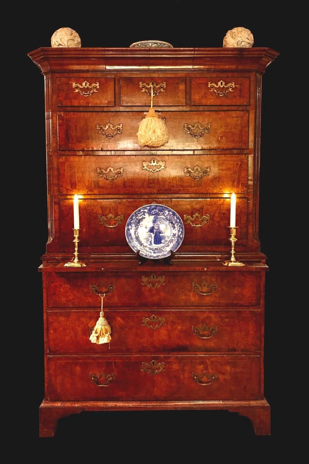 This 18th-century English walnut chest of drawers, created circa 1740, features a classic design characteristic of the period. The piece is constructed from solid walnut, showcasing the natural grain of the wood. It includes multiple drawers for storage, each with period-appropriate handles with writing panel. The beautiful overall condition reflects its age, with signs of wear consistent with use over the centuries. Back grounds are for period or modern effects,to view an item in that setting. Further images are available on request. Period furniture several Hundred years old will have marks,cracks,wear imperfections,repairs restoration as would be expected over the centuries. H 195cm W95cm D50cm
