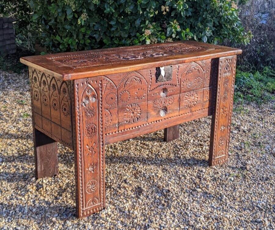 18th Century Welsh Oak Coffer Bach Welsh Dragon Carved 1741