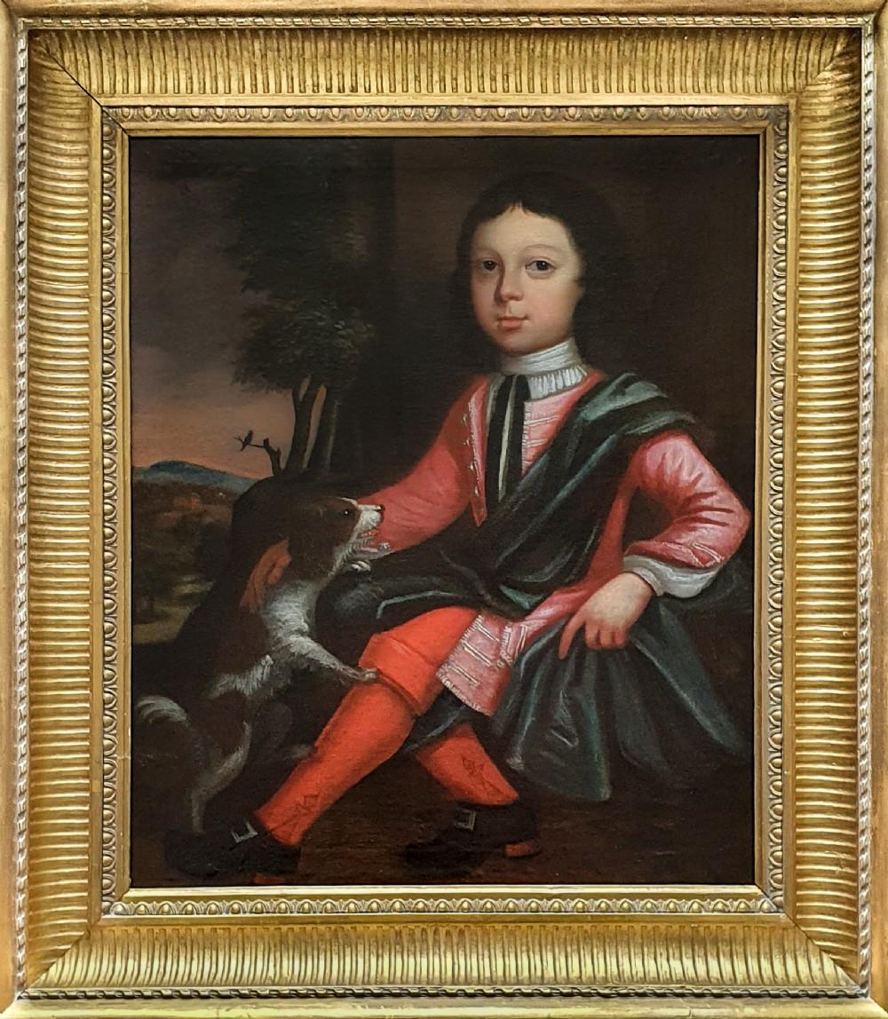 18th Oil Portrait Painting of Young Boy Sitting with Pet Spaniel Dog c.1720